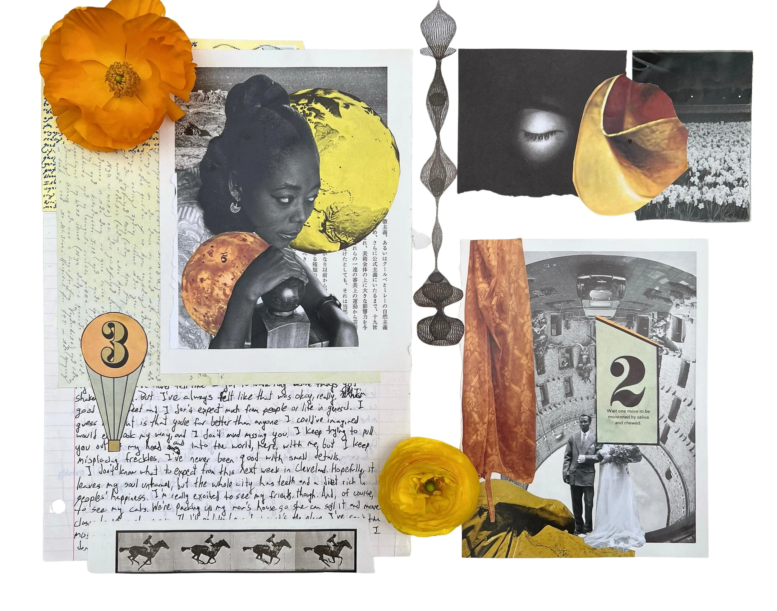 deliberation. Mixed media collage with photography from a James Barnor book, flowers, letters from a college pen pal, and a clipping from the SF MoMa catalogue ft. Ruth Asawa.